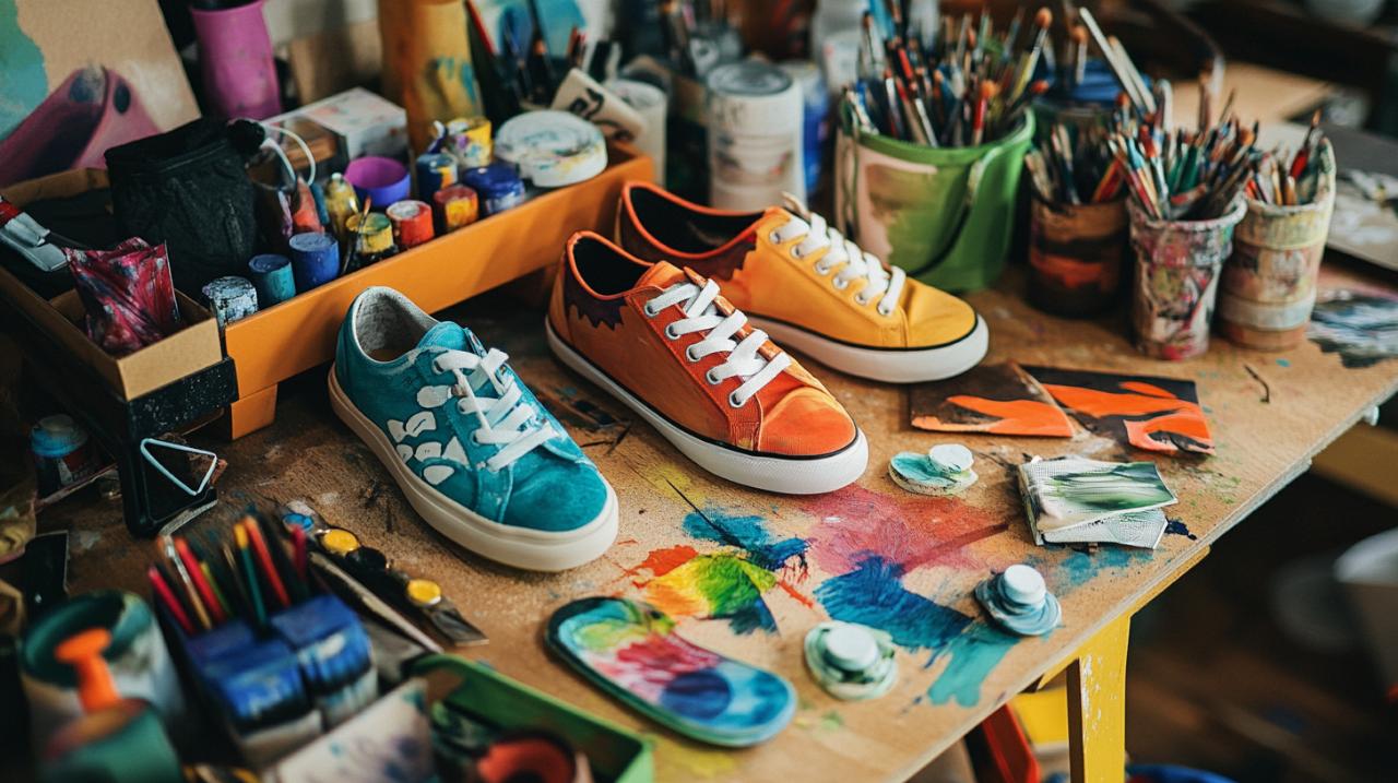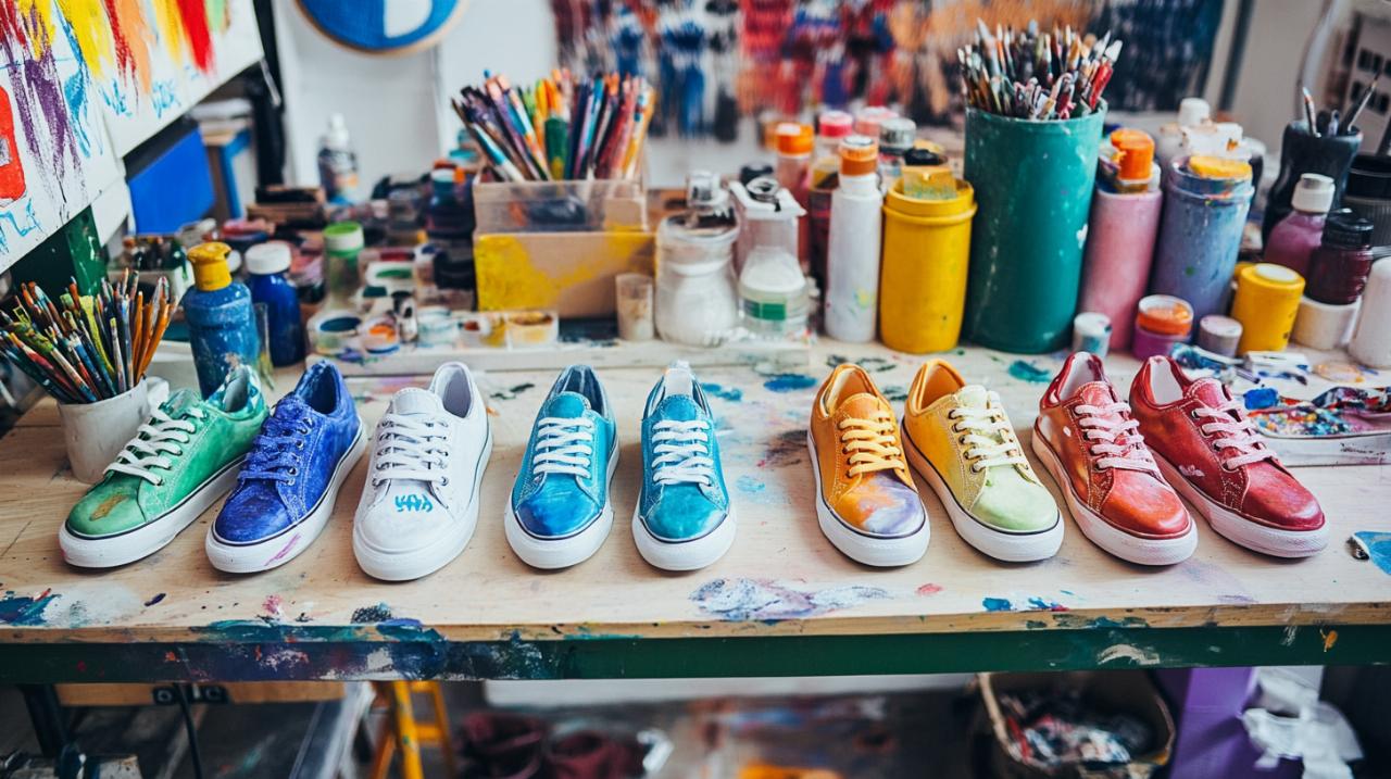 Whilst paint dominates many customisation projects, three-dimensional elements add tactile interest and catch light in ways flat designs cannot. Embroidery brings texture and permanence to canvas shoes, with designs ranging from subtle monograms to elaborate scenes stitched across multiple panels. Patches and pins offer instant personality without requiring artistic skill, as collections of enamel pins or fabric patches can be arranged to reflect interests, fandoms, or aesthetic preferences. These removable elements also provide flexibility, allowing you to refresh the look of your shoes by swapping components as your mood or style evolves. Studded and spiked designs inject edge and attitude, with metal hardware applied along seams, across toe caps, or in geometric patterns. These embellishments require careful placement to avoid discomfort during wear, particularly avoiding areas that flex significantly or contact the ground. Chrome and metallic finishes transform shoes into futuristic statements, achieved through metallic paints or chrome spray applications that create mirror-like surfaces. These eye-catching finishes demand especially careful surface preparation, as any imperfection becomes magnified by the reflective quality. Three-dimensional fabric paint enables you to create raised designs directly on the shoe surface, adding depth to florals, text, or abstract patterns that stand proud from the base material. Tie-dye techniques adapted for footwear involve binding white canvas shoes with rubber bands before applying fabric dyes in chosen colours, creating the organic colour bleeds associated with this retro aesthetic. For subtle sophistication, consider adding custom laces in unexpected materials such as leather, satin, or reflective cord, or replacing standard eyelets with coloured or oversized versions that become design features rather than functional necessities. Each embellishment should be secured with appropriate adhesives or stitching to ensure it withstands wear, as nothing undermines a beautiful custom design faster than components falling off during use. Once your creative vision stands complete, protecting it becomes paramount. Applying multiple coats of protective sealant specifically formulated for flexible materials shields paint from scuffs, moisture, and UV fading whilst maintaining the natural flex of the shoe. These sealants require several hours to cure fully, so resist the temptation to wear your creations immediately, allowing them to set properly ensures your hard work endures. Proper care extends the life of customised footwear considerably, starting with avoiding extreme weather whenever possible, as heavy rain or snow can compromise even well-sealed designs. If your shoes do get wet, pat them dry with a soft cloth and allow them to air dry away from direct heat sources, as radiators or hair dryers can cause materials to warp or adhesives to fail. Regular gentle cleaning with a damp cloth and mild soap maintains appearance without harsh chemicals that might degrade decorative elements. Storage matters too, with cool, dry locations away from direct sunlight preventing colour fading and material degradation. Keeping custom shoes in their original boxes or dedicated containers, stuffed with paper to maintain shape, ensures they remain pristine between wears. Touch up any chips or wear spots promptly to prevent damage from spreading, and check embellishments periodically to ensure they remain securely attached. With these practices, your personalised footwear will continue turning heads and sparking conversations for seasons to come, standing as wearable proof of your creativity and individual style.